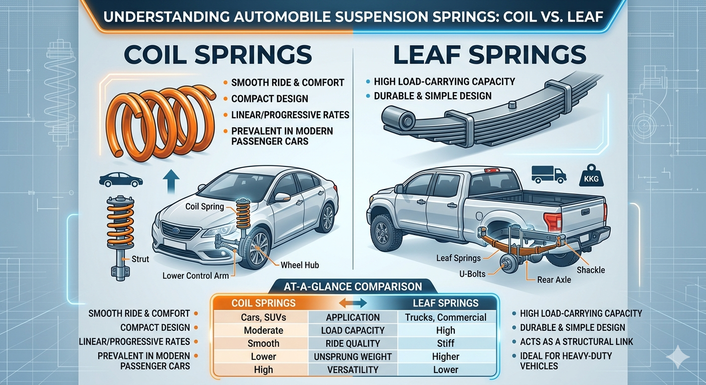 را دو نوع اساسی از فنرهای تعلیق خودرو هستند فنرهای سیم پیچ و چشمه های برگ . این دو جزء نشان دهنده فناوری اساسی مورد استفاده برای پشتیبانی از وزن خودرو و جذب ضربه های جاده ای در اکثریت قریب به اتفاق طراحی های مدرن و کلاسیک خودروها هستند. در حالی که سیستمهای دیگری مانند فنرهای بادی یا میلههای پیچشی وجود دارند، تغییرات سیمپیچ و برگ به دلیل قابلیت اطمینان، مقرونبهصرفه بودن و عملکرد اثباتشدهشان در طول دههها تکامل مهندسی، استانداردهای صنعتی باقی میمانند.